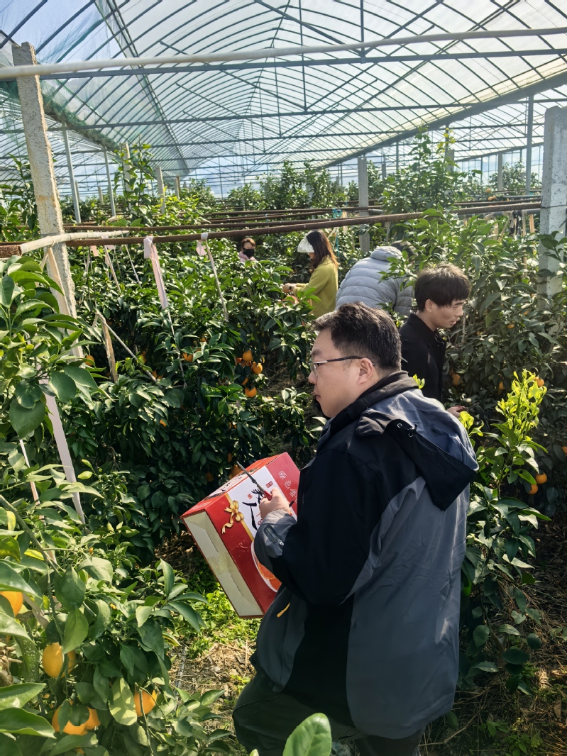 午餐后稍作休整,大家前往东渡橘子基地体验采摘乐趣。走进果园,饱满的橘子挂满枝头,果香四溢。成员们手提果篮,穿梭在橘树间,亲手采摘、品尝新鲜果实,感受着丰收带来的满满幸福感,欢声笑语回荡在田间地头。